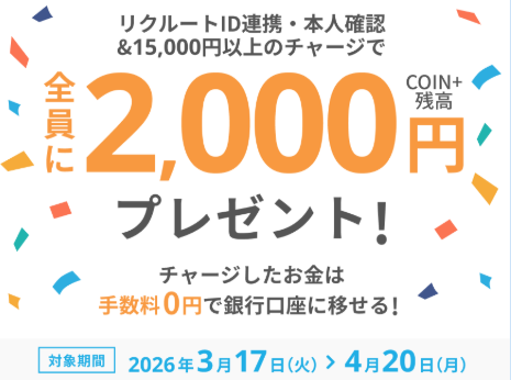 その1 本人確認&リクルートID連携&累計15,000円以上のチャージ:最大2,000円プレゼント